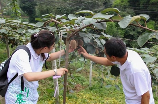 “聚猕乡振”团队正在查看猕猴桃生长情况。四川农业大学供图