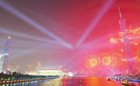 广州海心沙上演包括烟花预演在内的亚运开幕式带妆彩排