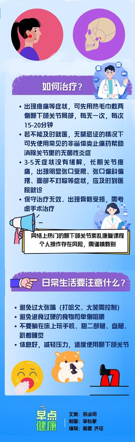 陈乃龙建议,在日常生活中要保持良好行为习惯,例如平时避免过大张嘴,在打哈欠、大笑时也需进行适当的控制;避免咀嚼过硬的食物和单侧咀嚼,不要躺床上玩手机、跷二郎腿、盘腿、趴着睡觉,从而保护我们脆弱的颞下颌关节。