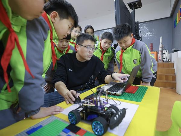 3月12日,在浙江省嘉兴市实验小学科技城校区科创中心内,老师指导学生通过编程为智能小车设计自动行驶算法。近年来,嘉兴市南湖区不断加强中小学人工智能教育,多所学校荣获“全国青少年人工智能活动特色单位”“全国人工智能教育示范基地”等荣誉。新华社记者 徐昱/摄