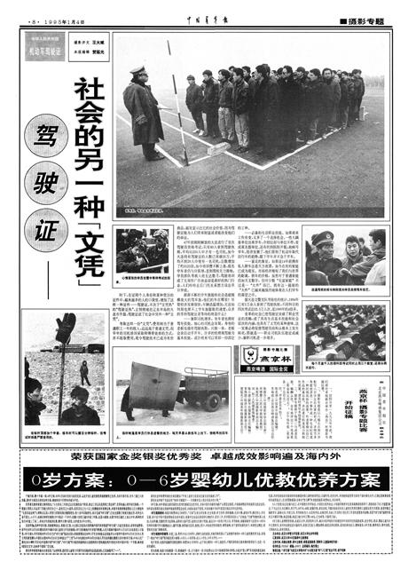 1995年1月4日,《中国青年报》第8版整版刊登了摄影专题《驾驶证——社会的另一种“文凭”》,生动展现了20世纪90年代辽宁大连的学车热潮。作者为时任大连日报社摄影记者王大斌,编辑是中青报原摄影部主任贺延光。中青报“摄影专题”版面就此开启,每周一期,以8幅左右的照片并含短文的形式讲述一个新闻故事,成为国内报纸摄影专题版的头一份。此后,国内多家媒体纷纷推出摄影专版,刊登成组照片报道。