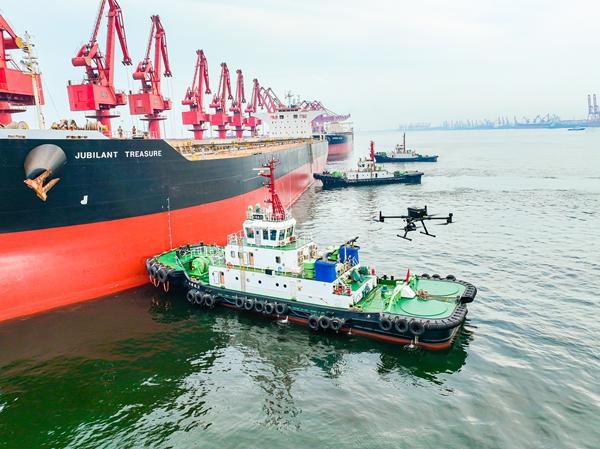 在港口作业现场,数架警用无人机在空中巡查,集装箱卡车在港区内穿梭。