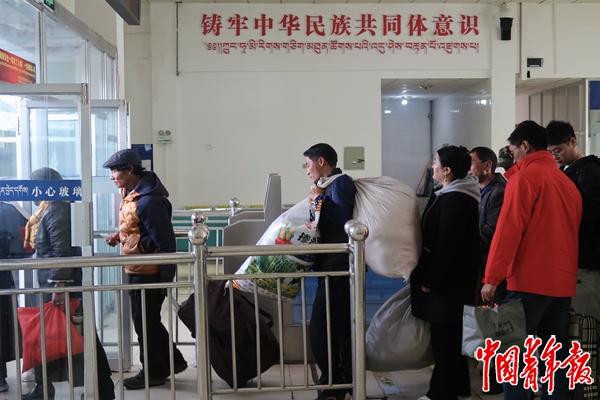 帕那镇帕那社区居委会主任嘎达第一次坐火车到拉萨,在那里买了他人生中的第一个行李箱,他发现这个带轮子的箱子比麻袋更方便。如今车站里接近一半的藏民都在使用行李箱。