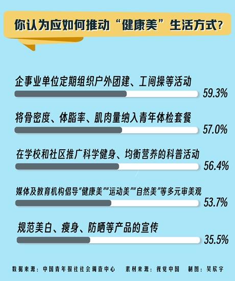 你认为应如何推动“健康美”生活方式?调查中,59.3%的受访青年建议企事业单位定期组织户外团建、工间操等活动,57.0%的受访青年建议将骨密度、体脂率、肌肉量纳入青年体检套餐,56.4%的受访青年期待在学校和社区推广科学健身、均衡营养的科普活动。此外还有:媒体及教育机构倡导“健康美”“运动美”“自然美”等多元审美观(53.7%),规范美白、瘦身、防晒等产品的宣传(35.5%),上好大中小学的体育课,充分锻炼身体(22.2%)等。