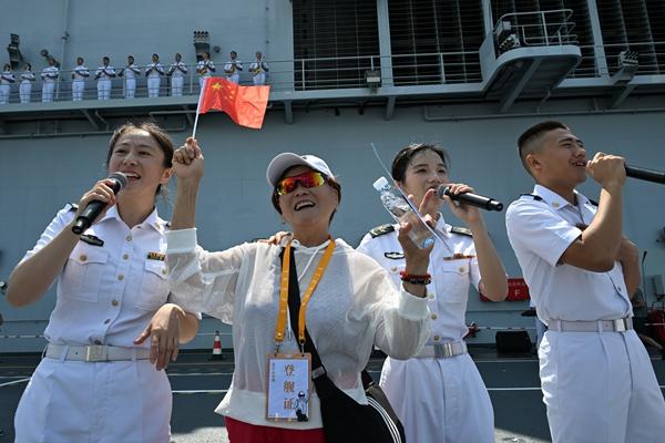 在山东舰飞行甲板,每天都安排了官兵和军乐队奏唱《我爱你中国》《歌唱祖国》《东方之珠》等歌曲。参观市民踏上飞行甲板后,立即被美妙的歌声吸引过去,航母甲板也化作了抒发爱国情怀的舞台。