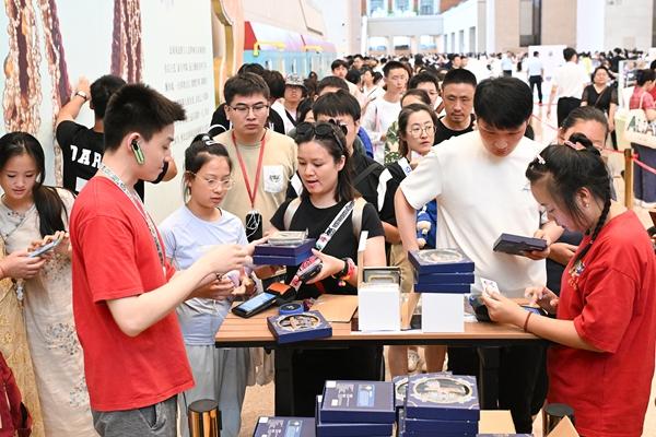 7月19日中午12点多,中国国家博物馆现场诞生了一名“幸运观众”。来自四川成都的教师罗莉,买到了第200万件凤冠冰箱贴。而不到4个月前,3月25日,100万件的纪录也才诞生。当天,买到第100万件凤冠冰箱贴的“幸运观众”——来自山东东营的李雅菲,受邀重返国博,为罗莉颁发纪念版凤冠冰箱贴及收藏证书,完成了一次“接力”。