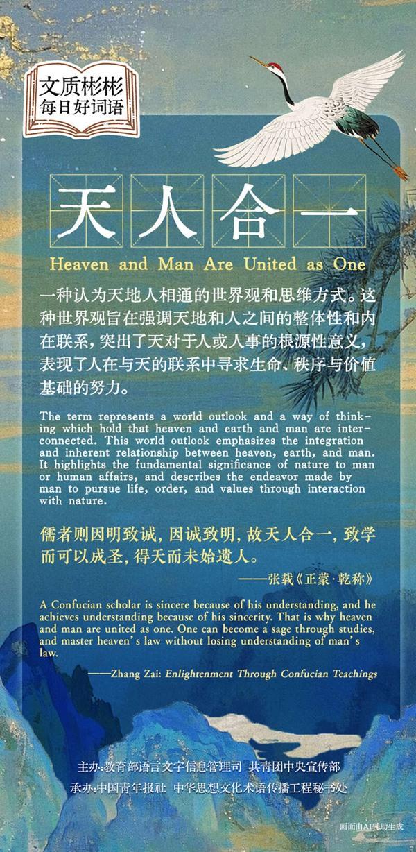 The term represents a world outlook and a way of thinking which hold that heaven and earth and man are interconnected. This world outlook emphasizes the integration and inherent relationship between heaven, earth, and man. It highlights the fundamental significance of nature to man or human affairs, and describes the endeavor made by man to pursue life, order, and values through interaction with nature. The term has different ways of expression in history, such as heaven and man being of the same category, sharing the same vital energy, or sharing the same principles. Mencius, for one, believed that through mental reflection one could gain understanding of human nature and heaven, emphasizing the unity of mind, human nature, and heaven. Confucian scholars of the Song Dynasty sought to connect the principles of heaven, human nature, and the human mind. Laozi maintained that“man’s law is earthly, earth’s law is natural, and heaven’s law is dao.”Depending on a different understanding of heaven and man, the term may have different meanings.