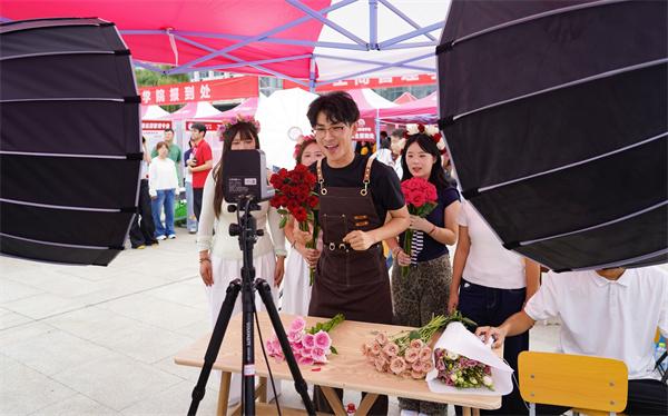9月5日,在淄博职业技术大学的迎新现场,工商管理学院设置云南鲜花直播,学长们化身“带货主播”,为新生带来一堂生动有趣、沉浸式的“专业初体验”课程,帮助他们了解真实的电商直播运营流程,直观感受数字营销的魅力。淄博职业技术大学供图