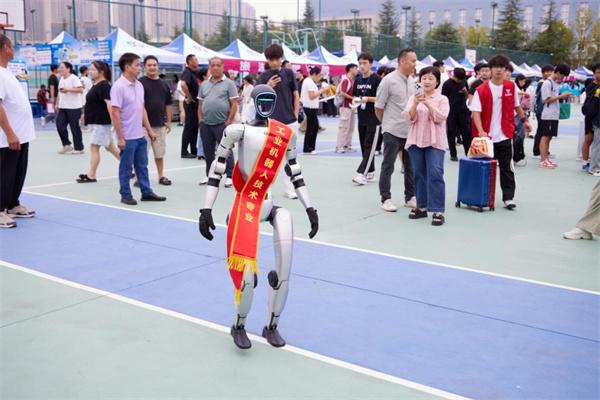9月4日,在湖北工业职业技术学院迎新现场,为展示专业办学特色,各二级学院将无人机、机器狗等实训设备搬到迎新现场。图为人形机器人迎新生引来围观。湖北工业职业技术学院供图