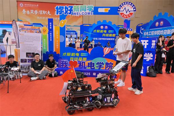 9月3日到5日,深圳职业技术大学迎来了万余名2025级新生。今年,学校共录取本科新生1200余人,专科新生9300人。现场,各学院推出各种引人注目的迎新活动。图为机电学院“机器人竞技与创新协会(RCIA)”携多款自主研发机器人迎接新同学。深圳职业技术大学供图