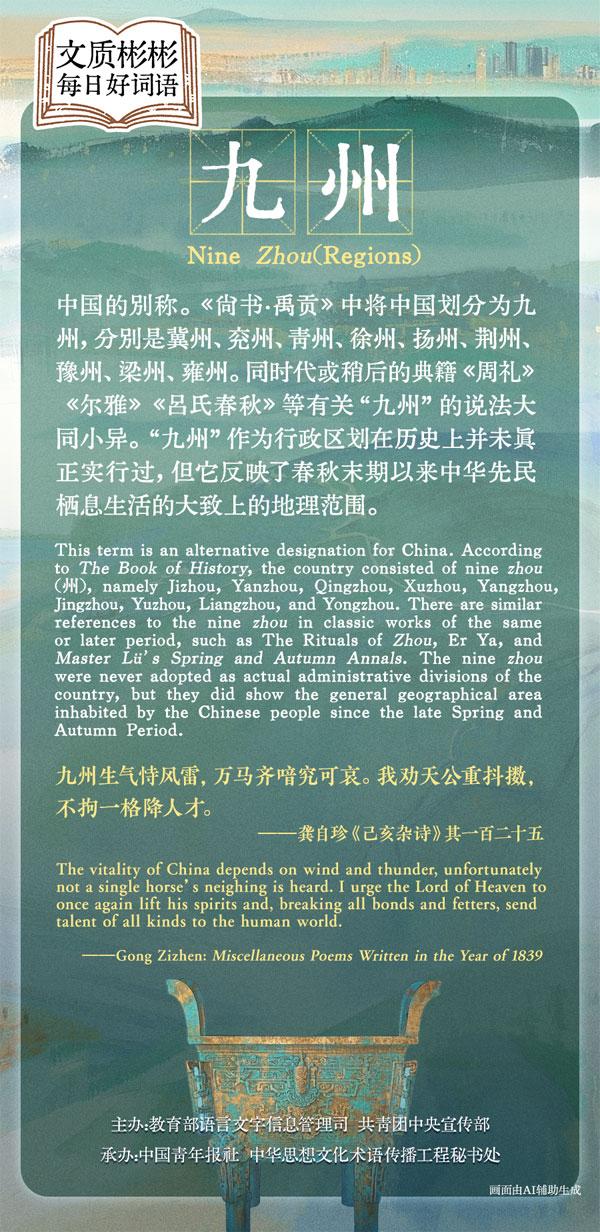 This term is an alternative designation for China. According to The Book of History, the country consisted of nine zhou, namely Jizhou, Yanzhou, Qingzhou, Xuzhou, Yangzhou, Jingzhou, Yuzhou, Liangzhou, and Yongzhou. There are similar references to the nine zhou in classic works of the same or later period, such as The Rituals of Zhou, Er Ya, and Master Lü's Spring and Autumn Annals. The nine zhou were never adopted as actual administrative divisions of the country, but they did show the general geographical area inhabited by the Chinese people since the late Spring and Autumn Period.