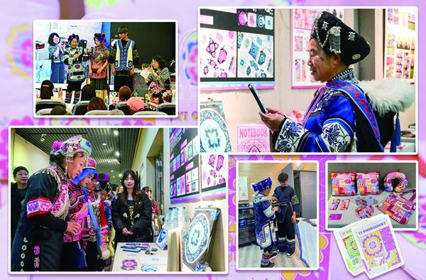 设计大赛优秀作品展开幕当天,展厅中漾开一片流动的彩霞——普玉珍、郭晓艳等10名各级非物质文化遗产代表性传承人,身着本支系的盛装翩然而至,瞬间成为全场焦点,学生们静静驻足,凝视着这些古老的手艺,眼中满是崇敬;而当传承人们看到学生作品中迸发的奇思妙想时,也不禁面露惊喜。普玉珍连连赞叹:“真是后继有人啊!”她说:“我们从中感受到了年轻人对非遗的审美偏好与消费需求,这也为我们今后的产品创新带来许多灵感。”