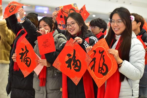 1月19日,在安徽阜阳西站候车大厅,大学生们参加“一城暖阳·温暖回家路”活动。
