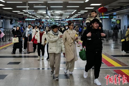 当日,春节假期进入末尾,京津冀各大车站迎来返程客流高峰。据了解,北京地区预计到达72.7万人。回乡返程、外出务工、旅游等交叠,春运迎来高峰期。全国铁路预计发送旅客1530万人次,计划加开旅客列车1813列。根据售票情况分析,16日,北京、广州、成都、重庆、西安、武汉等城市出发客流较多,北京、上海、广州、深圳、成都等城市到达客流较多。中青报·中青网记者 赵迪/摄