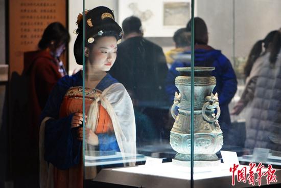 2月16日,洛阳博物馆内一名游客打扮成唐朝仕女,与文物合影。中青报·中青网记者 刘言/摄