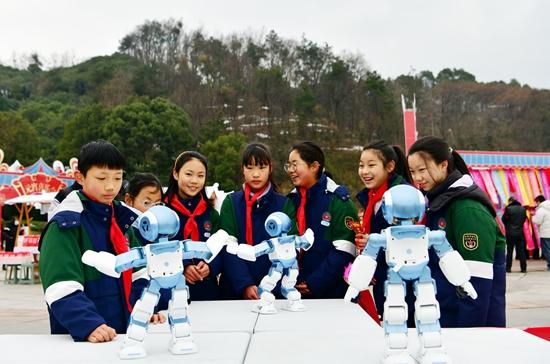 2月24日,湖北省宜昌市,秭归县屈原故里文化旅游区屈原广场,学生在观看机器人表演。当日,湖北省宜昌市秭归县科协在三峡坝前的屈原故里文化旅游区屈原广场举行以“科普大篷车进景区、近距离感受科技魅力”为主题的科普志愿服务活动。学生近距离感受科技魅力,快乐度过假期。视觉中国供图