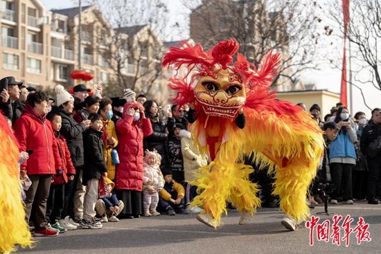 2月24日,北京市朝阳区孙河乡元宵节民俗文化庙会,舞狮与观众互动表演。中青报·中青网记者 李隽辉/摄