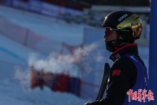 2月21日,内蒙古呼伦贝尔扎兰屯市,金龙山滑雪场,第十四届全国冬季运动会自由式滑雪空中技巧公开组男子决赛,内蒙古队杨龙啸完赛后等待成绩。