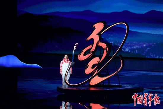 2月17日,内蒙古呼伦贝尔,第十四届全国冬季运动会开幕式上,最后一棒火炬手武大靖点燃“冬”字,位于场馆外的主火炬塔同时被点燃。