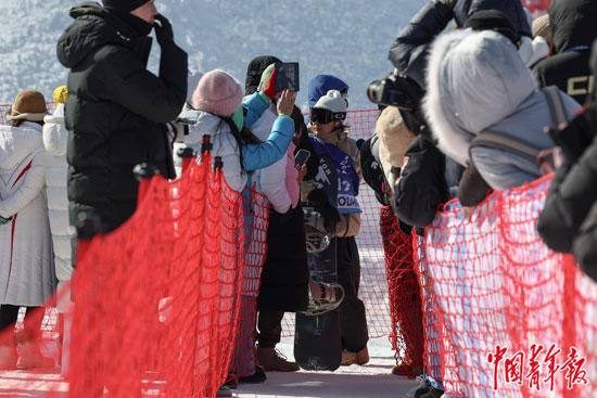 2月23日,内蒙古呼伦贝尔扎兰屯市,金龙山滑雪场,“十四冬”单板滑雪大跳台男子公开组决赛结束后,获得冠军的苏翊鸣被记者包围。在第一轮失误的苏翊鸣一度落后对手数十分,最终他以领先第二名7分的优势夺冠。