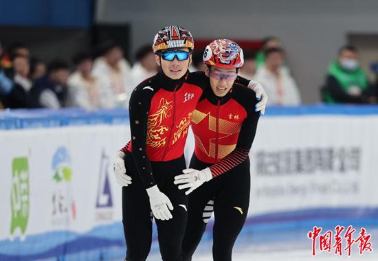 2月17日,内蒙古呼伦贝尔海拉尔赛区,第十四届全国冬季运动会短道速滑男子500米决赛结束后,黑龙江队任子威(左)和夺冠的吉林队孙龙互相拥抱。