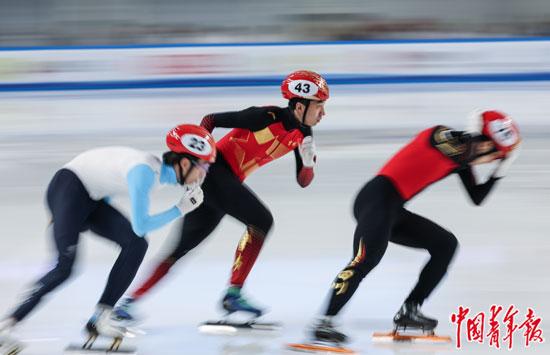 2月18日,内蒙古呼伦贝尔,第十四届全国冬季运动会短道速滑男子1000米决赛B组,吉林队任浩博(中)在比赛中。