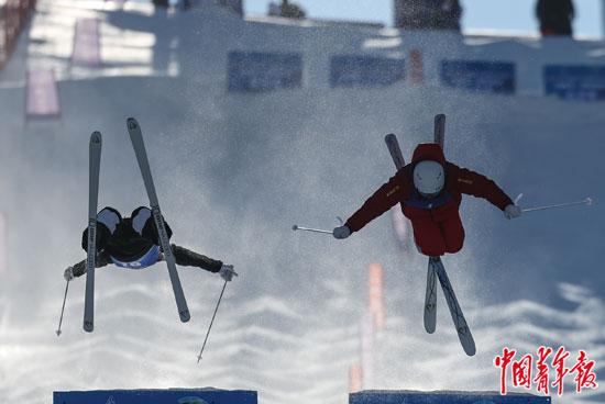 2月19日,内蒙古呼伦贝尔扎兰屯市,金龙山滑雪场,第十四届全国冬季运动会公开组男子双人雪上技巧决赛,河南队付俊逸(右)和黑龙江队陈康同组竞技。付俊逸获得该项目冠军。