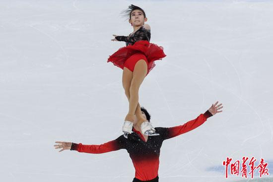 2月25日,内蒙古呼伦贝尔海拉尔赛区,第十四届全国冬季运动会公开组双人滑,湖北队组合张轩绮(上)/丰闻强在自由滑比赛中。