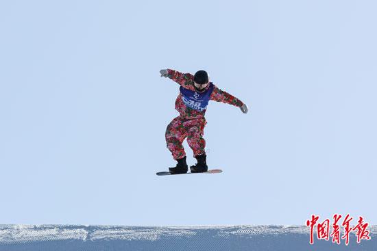 2月23日,内蒙古呼伦贝尔扎兰屯市,第十四届全国冬季运动会单板滑雪大跳台男子公开组决赛,内蒙古队倪丙绅穿着引人注目的“大花袄”雪服。
