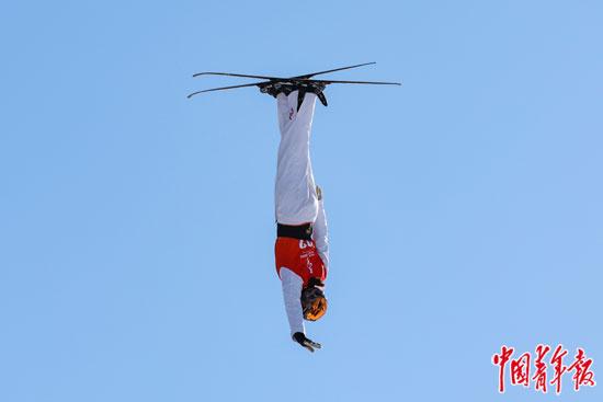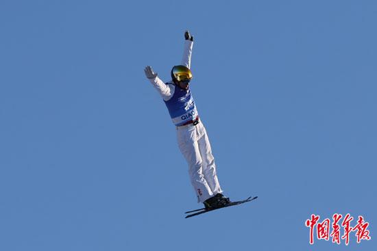 2月21日,内蒙古呼伦贝尔扎兰屯市,第十四届全国冬季运动会自由式滑雪空中技巧男子公开组决赛,辽宁队贾宗洋在比赛中。