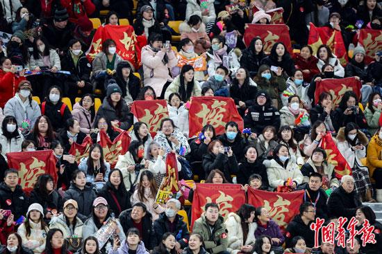 2月17日,内蒙古呼伦贝尔海拉尔赛区,第十四届全国冬季运动会短道速滑比赛现场,看台上的粉丝举着印有林孝埈、任子威等运动员名字的横幅。