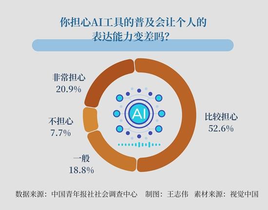 调查显示,73.5%的受访青年担心AI工具的普及会让个人的表达能力变差,其中,20.9%的受访青年表示非常担心。