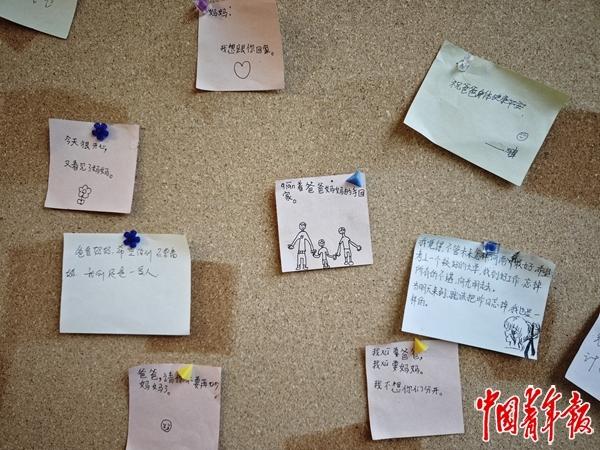 请孩子们给父母写纸条是她们参考奶茶店的心愿墙设计的,在翠屏人民法庭,这面背板墙叫“家言家语墙”,墙上现有的纸条只是经过书写人和监护人同意后公开的一小部分。