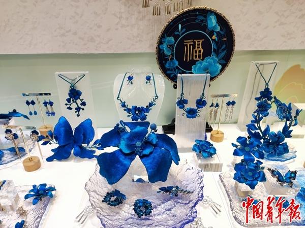 回国后,陈国桃立刻投入研发。由此诞生的“蓝色系列”苗绣首饰,一直被围观,常常卖断货。近日,中青报·中青网记者在一个非遗展览上遇到陈国桃时,她正被举着手机扫码支付的观众围得严严实实。“这种蓝色是我们的独家发明,有苗药的成分。由于是手工制作,不同批次的蓝色会有细微差别,这也正是非遗的魅力。”