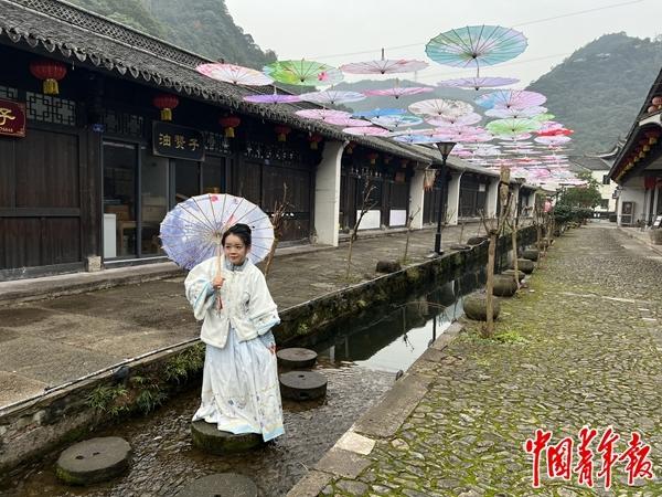 12月6日,浙江省台州市三门县横渡镇岩下潘村,身着古装的游客在村里拍照。岩下潘村曾经是一个只有十几名老年人留守的“空心村”,十多年来,借助“千万工程”,当地大力发展乡村旅游,村民年均收入从不足2000元增长到10万元。中青报·中青网 记者 李隽辉/摄