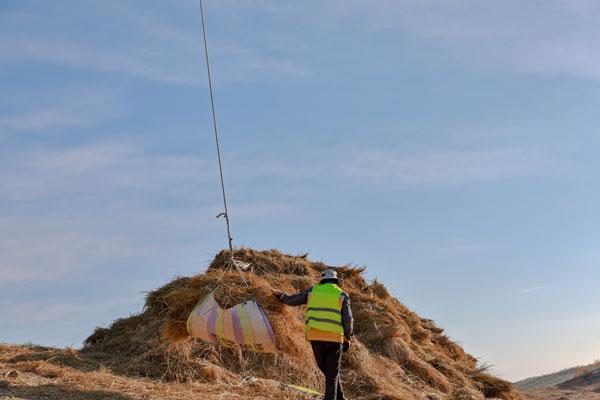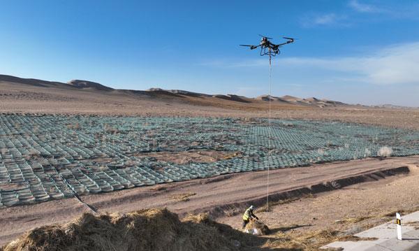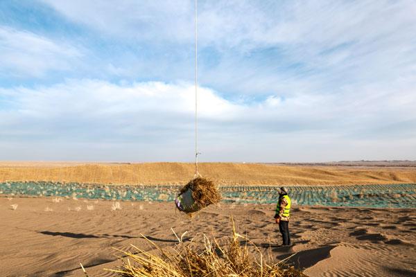 12月3日,甘肃酒泉,金塔县城至大墩门公路“三北”工程防沙治沙区域路段,无人机悬挂稻草运至沙漠深处,助力防沙治沙。视觉中国供图