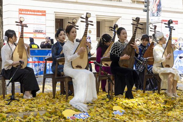 12月8日,青年音乐家在银杏树下演奏。当日,一年一度的“银杏音乐会”在上海音乐厅南广场举行。在银杏树下,音乐家们倾情演绎,为市民带来沉浸式海派情境艺术盛宴。