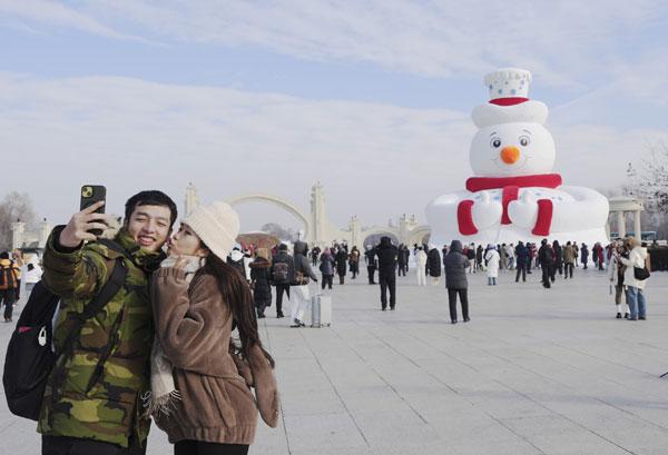 12月9日,游客在哈尔滨太阳岛风景区正门广场与大雪人合影。12月8日,哈尔滨今冬第一个大雪人“雪人先生”在太阳岛风景区落成。大雪人高20米,用雪量4000立方米。新华社记者 王松/摄