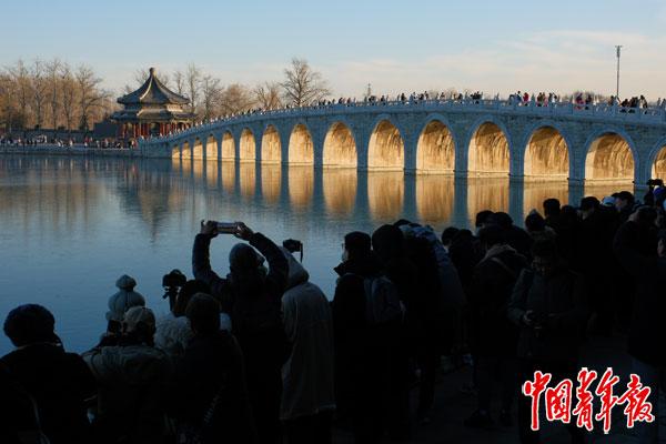 12月9日下午,北京颐和园,游客们聚集在颐和园南湖岛一侧,拿出各种各样的设备拍摄十七孔桥“金光穿洞”。中青报·中青网记者 田嘉硕/摄