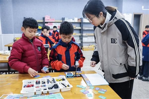 12月10日,浙江诸暨市明德小学的学生在科学实验室上机器人搭建课程。学校在落实国家智慧教育课程的同时,积极打造人工智能课程体系,开设趣味编程、C++语言、机器人搭建、无人机创客等普惠式课程,同时引进了AR虚拟现实科普实验室,在动手操作中了解人工智能、感受科技魅力,给孩子们播下科学梦想的种子。新华社记者 徐昱/摄