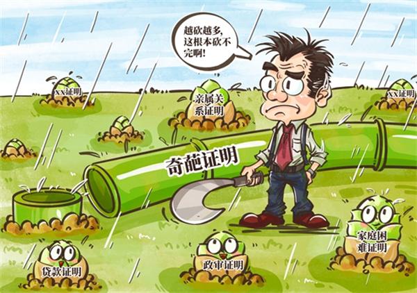 近年来,各地大力为基层减负,规范村(社区)组织工作事务,由基层开具的证明大幅减少。然而,一些企业和单位仍要求开具不合理的“奇葩证明”,这给村、社区带来了极大的困扰,也让群众在办事过程中频繁遭遇梗阻,甚至引发干群矛盾。要解决“奇葩证明”问题,需双管齐下:一是压实企业和单位责任,要求其自行核实信息,不转嫁责任给基层;二是打破信息壁垒,完善信息共享和电子化证件系统,简化办事流程。漫画:程璨
