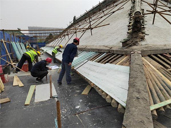 施工单位根据设计图纸要求及勘察实际情况,对屋面大脊、垂脊、瓦件、檐头等部位,进行了整体排查、编号、拍照,遵循文物修缮“最小干预”的原则,更换腐朽的望板及木构件,最大程度利用原始瓦件,剔除后期补配的不规则瓦件,按照原始瓦件形制开模烧制后,进行屋面瓦瓦(为古建筑铺瓦的工序——记者注)恢复。