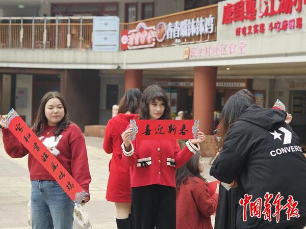 许多青春小店的创业故事、爱心故事从重庆多地汇聚到民主村会场青春小店快闪市集。对联、糖画、剪纸、面塑、潮流手办、锦鲤挂饰……青春小店商家现场摆摊,青年书法爱好者现场写“福”字、春联赠送给居民、游客。