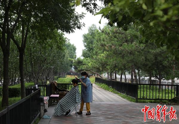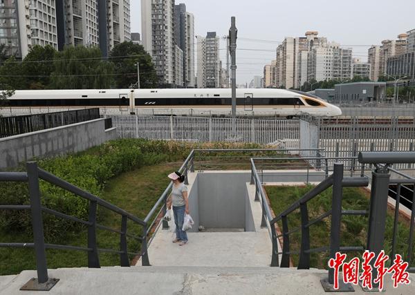 铁路两旁的绿化带,如今变成了长长的口袋公园,供人们休闲娱乐。有散步的、锻炼身体的、带孩子来玩的,天气暖和的时候,还有“户外理发师”在这里支起摊子招揽顾客。通道的西侧出入口旁,修建了一条笔直的大道,直通两公里以外的北京朝阳站。随着去年12月北京地铁3号线的开通,最近的地铁口离这里约1公里,附近的交通也变得更便利了。