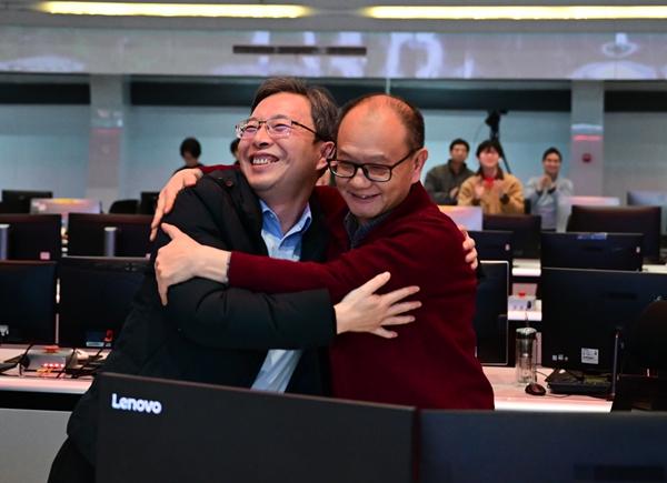 1月20日,EAST物理实验总负责人龚先祖(右)和中国科学院合肥物质科学研究院等离子体物理研究所副所长陆坤拥抱庆祝。