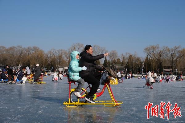 1月20日上午,北京什刹海冰场,市民们在冰场上玩耍,享受滑冰带来的乐趣。17日,冰层厚度达到安全标准的什刹海冰场正式开业,自明朝起就成为“冬嬉”著名场所的什刹海,毗邻北京中轴线,是北京开展冬季全民健身运动的重点区域之一。