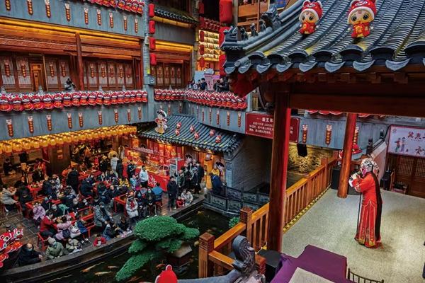 唐山宴副总经理魏永向中青报·中青网记者介绍,这座建筑是一直闲置未用的商场的存量资产,设计团队重塑了这里的空间形态,将唐山美食、文化与旅游完美结合,打造出了“餐饮+民俗+演艺+文创+旅游+研学”的沉浸式、全景化文旅商消费新场景。