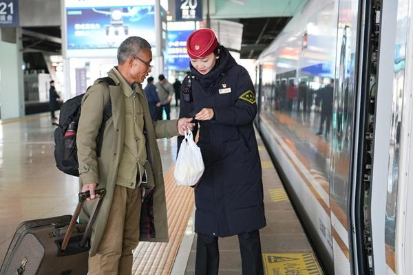 “让旅客微笑上车、满意下车”是他们的服务目标。“我们用实际行动扛起‘青春的旗帜’,用优质服务叫响‘共青团号’品牌,在今年春运中,我们会用青春的力量温暖每一位旅客。”她说。