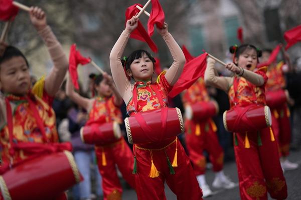 当地时间2月1日,葡萄牙里斯本,儿童在庆祝农历新年的游行中用鼓表演。视觉中国供图