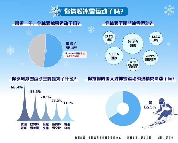 哈尔滨第九届亚洲冬季运动会正在火热进行中,掀起了人们对冰雪运动的新一轮关注热潮。上周,中国青年报社社会调查中心联合问卷网(wenjuan.com)进行的一项有1340名受访者参与的调查显示,最近一年,52.4%的受访者体验了冰雪运动,65.5%的受访者感觉周围人对冰雪运动的热情更高涨了,74.9%的受访者感觉冰雪运动热正逐渐由北方辐射到南方。